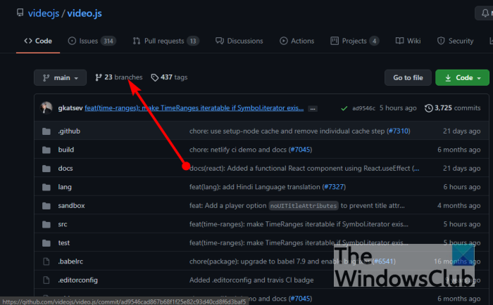 Pour ce faire, rendez-vous sur la page d'accueil du référentiel de votre choix, puis à partir de là, choisissez la branche avec laquelle vous vous sentez le plus à l'aise. Dans la plupart des cas, ce sera lebranche principale. Localisez-le, puis cliquez sur le lien Commits.