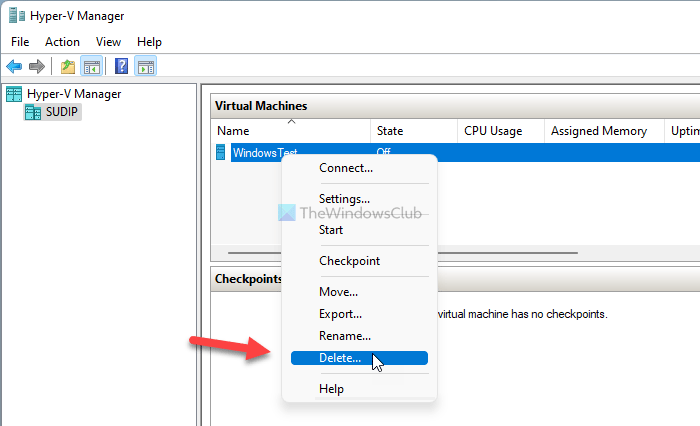 Si vous supprimez la machine virtuelle d'origine, l'identifiant unique sera également supprimé de votre ordinateur. Autrement dit, cela créera un espace pour que l’ancien identifiant soit installé sur votre ordinateur. Pour supprimer une machine virtuelle Hyper-V, procédez comme suit :