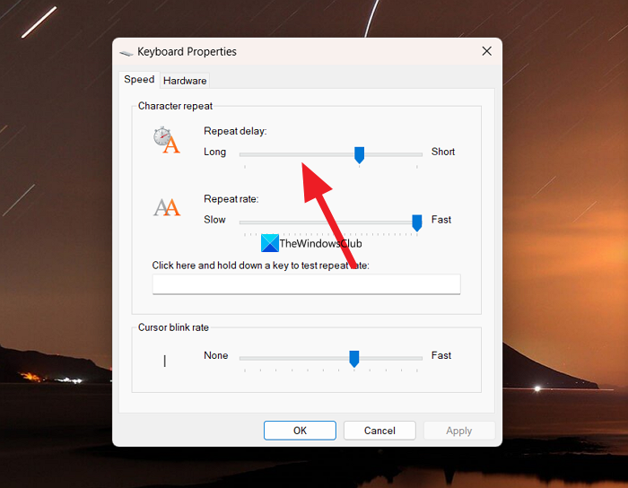 - Dans la section Répétition du personnage, réglez le curseur vers Long sous Délai de répétition. Ne l'ajustez pas trop longtemps, car vous pourriez avoir des difficultés à taper. Une fois le réglage terminé, cliquez surAppliqueret puisD'ACCORD. Fermez la fenêtre et voyez si cela a résolu le problème.