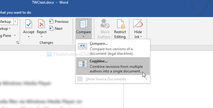 Ouvrez le document révisé dans Microsoft Word et passez duMaisononglet vers leRevoirlanguette. Dans leComparersection, vous verrez un bouton appeléComparer. Cliquez dessus et sélectionnez leCombineroption.