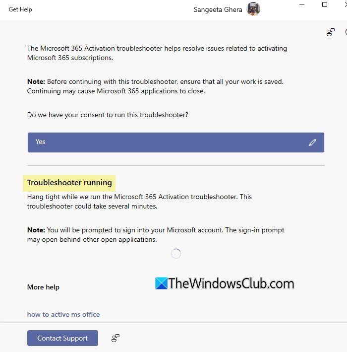 Si vous rencontrez des problèmes pour activer votre abonnement Microsoft 365, ne vous inquiétez pas. Microsoft propose un outil de dépannage intégré, appeléOutil de dépannage de l'activation de Microsoft 365qui peut automatiquement identifier et résoudre les problèmes courants qui empêchent l’activation de votre abonnement Microsoft 365. L'utilitaire de résolution des problèmes est disponible sous Windows 11/10 et peut facilement être lancé via l'application Obtenir de l'aide.