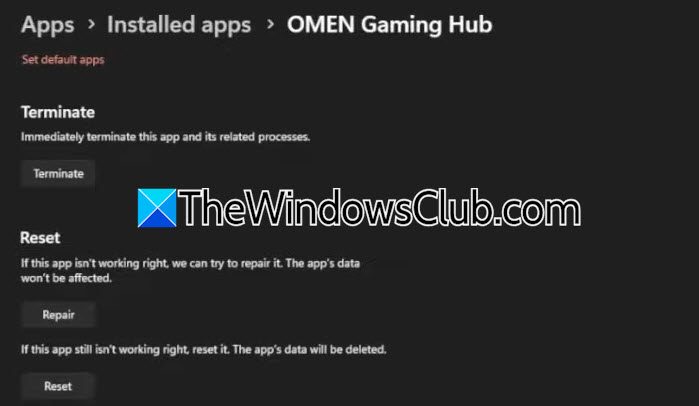 L'une des raisons pour lesquelles vous pouvez rencontrer ce problème est que le Omen Gaming Hub est corrompu ou mal configuré. Ces problèmes sont si courants que Windows propose des options pour les résoudre. Pour ce faire, suivez les étapes mentionnées ci-dessous.