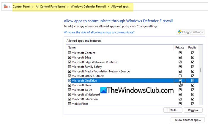 OuvrirPanneau de contrôleet changerAfficher paràGrandes icônes. CliquezPare-feu Windows Defender > Autoriser une application ou une fonctionnalité via le pare-feu Windows Defender. Sur l'écran suivant, cliquez surAutoriser une autre applicationp. Une fenêtre contextuelle apparaîtra. Parcourez et sélectionnez OneDrive.exe et cliquez surAjouterpour l'ajouter à la liste des applications autorisées. Assurer à la fois lecochesà côté de Microsoft OneDrive (privé, public) se trouventcoché.