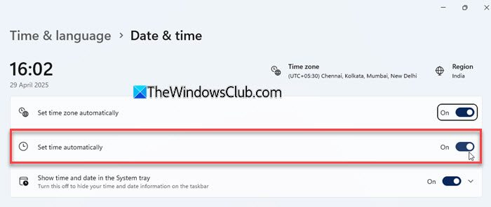 Pour résoudre ce problème, assurez-vous 'Régler l'heure automatiquement' est activé dans les paramètres Windows. Cliquez avec le bouton droit sur l'horloge dans la zone de la barre d'état système et cliquez surAjuster la date et l'heure. Assurez-vous que la bascule à côté deRégler l'heure automatiquementestSUR.