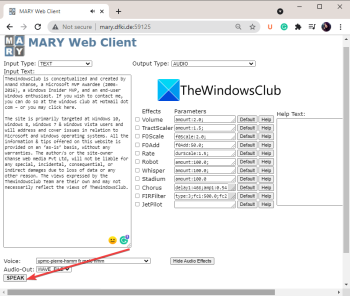 MARY TTS est un logiciel de synthèse vocale gratuit et open source pour Windows 11/10. Il s'agit d'un outil de conversion texte-parole multilingue gratuit écrit en Java. Outre l'anglais britannique et américain, il prend en charge un bon nombre de langues pour convertir votre texte. Certaines de ces langues sont le français, l'italien, l'allemand, le russe, le luxembourgeois, le suédois, le télougou et le turc.