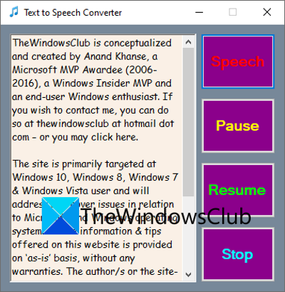 Comme tout autre logiciel TTS, il vous permet également de saisir manuellement votre texte ou de le copier et de le coller depuis le presse-papiers. Vous pouvez cliquer sur leDiscoursoption et il commencera à lire le texte avec une voix masculine par défaut. Des options de contrôle de lecture de base telles que la pause, l'arrêt et la reprise y sont fournies.