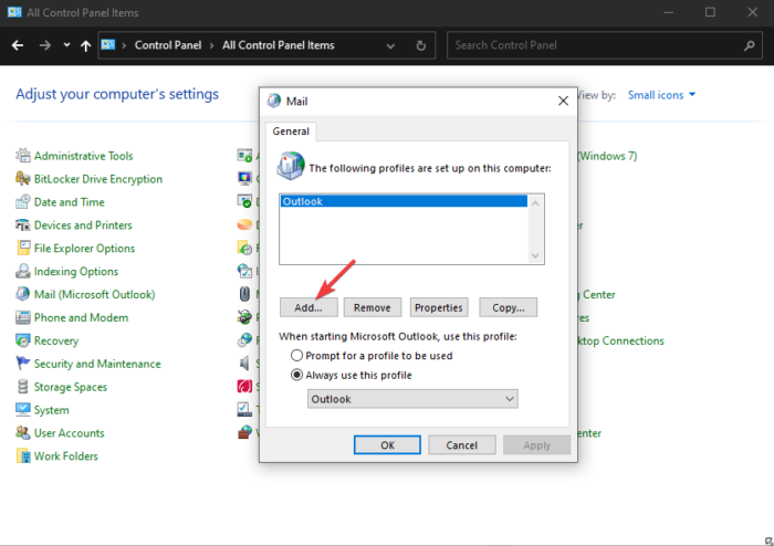 Il s'agit d'une solution de dernier recours s'il n'y a pas d'autre solution. Il se peut qu'il y ait un problème avec votre compte actuel et vous souhaiterez peut-être contacter Microsoft pour l'examiner. Pendant ce temps, créez-en un nouveau et voyez si le problème est résolu. Aller àComptes d'utilisateurs > Mail (Microsoft Outlook) > Afficher les profils > Ajouterdans le Panneau de configuration Windows et créez un nouveau profil Outlook. Créez de nouvelles règles et voyez si elles fonctionnent automatiquement avec le nouveau compte. Si tel est le cas, votre ancien compte a un problème.