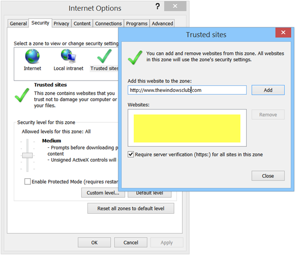 - SousAjouter ce site Web à la zone, saisissez les URL mentionnées ci-dessus, sélectionnezAjouterpuis sélectionnezFermer.