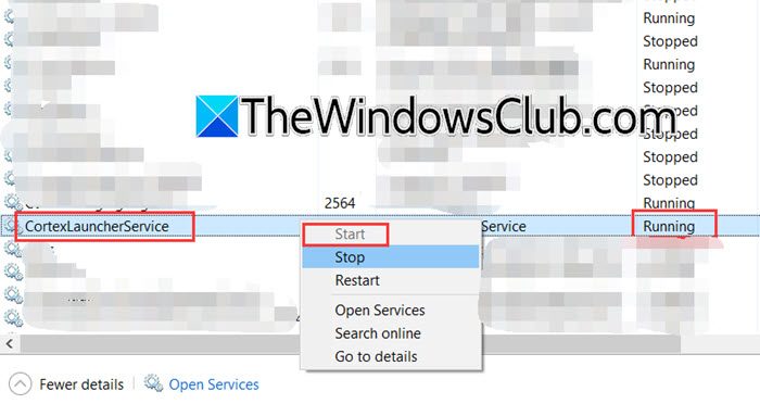 Le CortexLauncherService aide le Razer Cortex à gérer les ressources système, garantissant le bon fonctionnement de l'application et améliorant les performances de jeu. Nous devons vérifier et nous assurer qu'il fonctionne correctement. Pour ce faire, ouvrez leGestionnaire de tâches,allez dans l'onglet Services, recherchezCortexLauncherService,et vérifiez s'il fonctionne. S'il n'est pas en cours d'exécution, cliquez avec le bouton droit sur le service et sélectionnez Démarrer. S'il n'est pas en cours d'exécution, vous devez cliquer avec le bouton droit sur le service et sélectionner Démarrer.