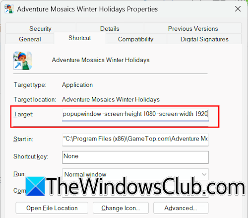Maintenant, allez sur le bureau, faites un clic droit sur le raccourci vers le jeu et sélectionnezPropriétés. Sélectionnez leRaccourcilanguette. Placez le curseur à la fin de la commande dans leCiblechamp, mettez un espace et entrez la commande suivante :