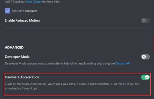 Cela peut sembler un peu déroutant, mais restez avec moi sur ce point. Discord utilise sonAccélération matériellefonctionnalité permettant d'utiliser le GPU de votre ordinateur à ses limites afin d'effectuer des tâches graphiques intensives. Par conséquent, si votre ordinateur dispose d'un processeur ancien ou faible, vous devez désactiver l'accélération matérielle, sinon l'activer.