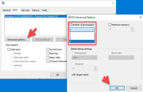 Pour ce faire, appuyez surGagner + R, tapermsconfig, et frappeEntrer. Vous serez redirigé vers leConfiguration du systèmefenêtre, allez à laBotteonglet, cliquez surOptions avancées, cocherNombre de processeurs, modifiez le nombre de processeurs au maximum, puis cliquez surD'ACCORD.