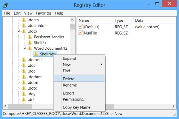 Si vous souhaitez supprimerNouveau document Word, il faudra chercher.docxclé et développez-la. Une fois cela fait, vous devrez supprimer leShellNouveauclé. Cela supprimera l'entrée permettant de créer un nouveau document Word du nouveau menu contextuel.