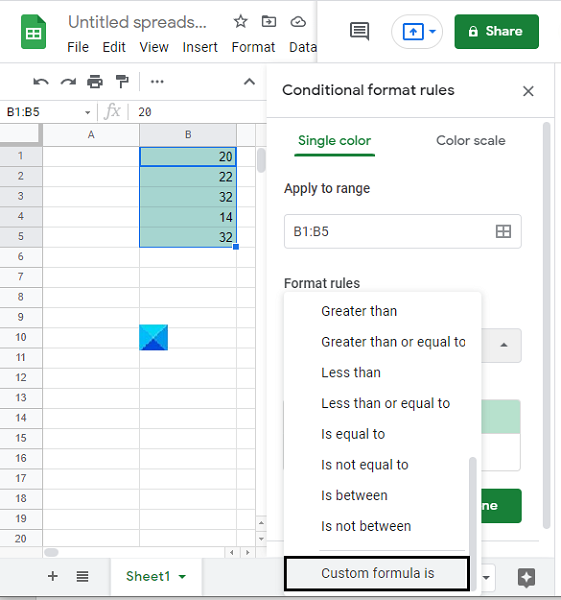 - Dans la liste déroulante "Formater les cellules si", sélectionnez "La formule personnalisée est".