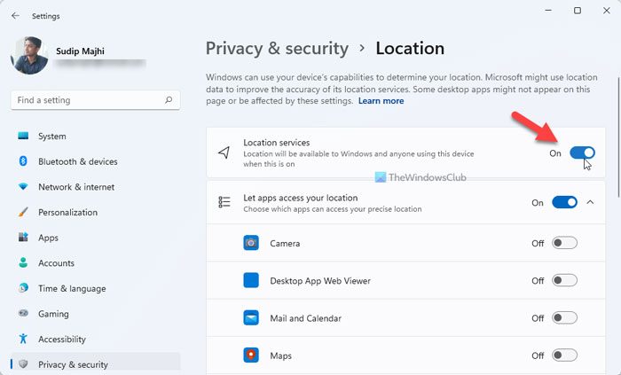 Pour autoriser les applications à utiliser la localisation dans Windows 11 et Windows 10, vous pouvez utiliser le panneau Paramètres Windows. PresseGagner+Jepour ouvrir les paramètres Windows et accéder àConfidentialité et sécurité > Localisation. À partir de là, vous devez basculer leServices de localisationbouton pour l'allumer ou l'éteindre. Il est également possible d'autoriser ou de bloquer l'utilisation des services de localisation par une application.