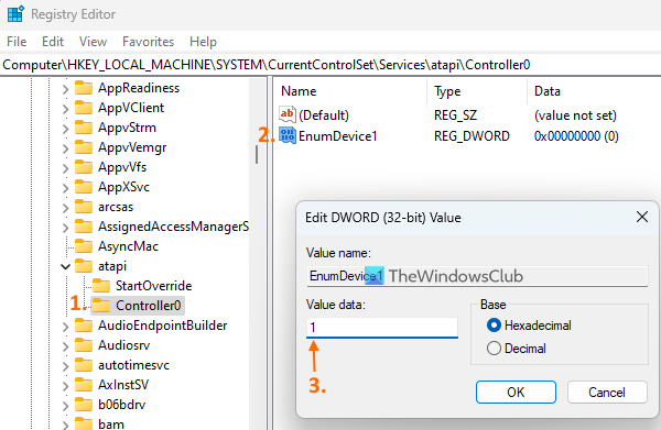 - ActiverleEnumDevice1Valeur DWORD afin que votre lecteur de CD/DVD puisse être reconnu. Pour cela, double-cliquez sur cette valeur pour ouvrir la zone d'édition. Mettre1dans leDonnées de valeurchamp et sélectionnez leD'ACCORDbouton