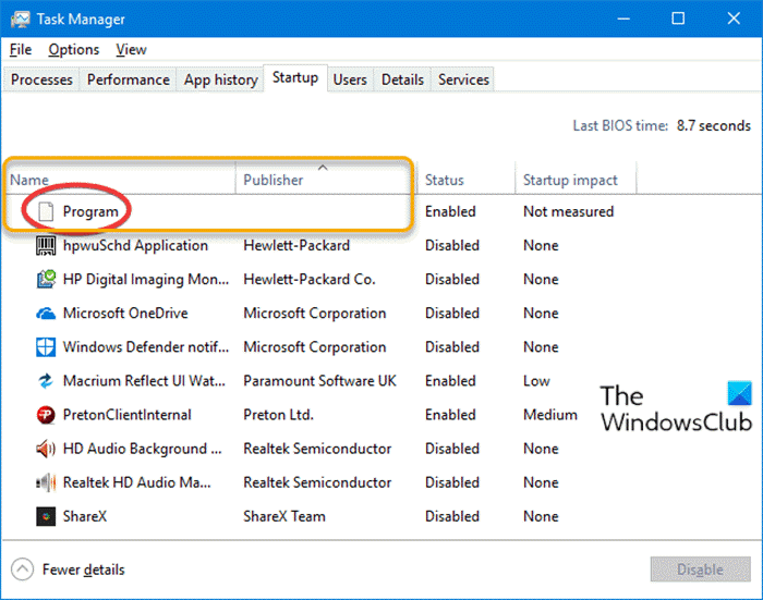 Si tuet accédez à l'onglet Démarrage, il répertorie les programmes enregistrés dans le groupe Démarrage ou la touche Exécuter pour s'exécuter automatiquement lorsque vous vous connectez. Mais vous pourriez voir une entrée appelée simplementProgramme, avec une icône vide et sans éditeur. Dans cet article, nous démystifions ce qu'est cette entrée de programme dans l'onglet Démarrage du Gestionnaire des tâches sous Windows 11/10 et si elle est sûre.