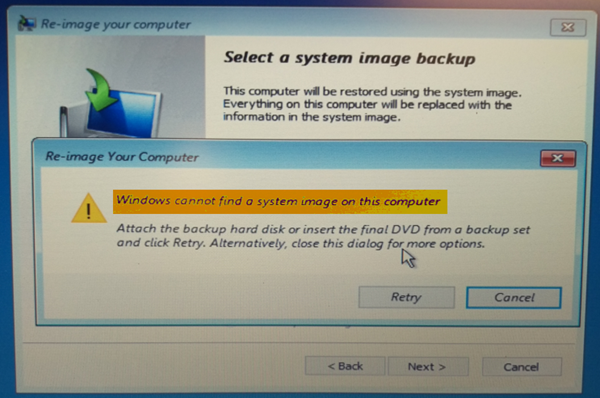 Windows ne trouve pas d'image système sur cet ordinateur. Connectez le disque dur de sauvegarde ou insérez le DVD final d'un jeu de sauvegarde et cliquez sur Réessayer. Vous pouvez également fermer cette boîte de dialogue pour plus d'options.