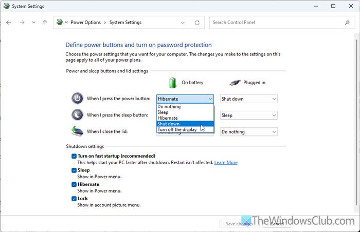 Ensuite, développez leQuand j'appuie sur le bouton d'alimentationmenu déroulant et sélectionnez leFermeroption pourSur batterieainsi queBranché.