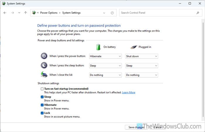Pour ce faire, ouvrez le Panneau de configuration et accédez àOptions d'alimentation. Ensuite, cliquez sur leChoisissez ce que font les boutons d'alimentationoption.
