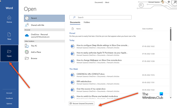 Ouvrez le mot, cliquezOuvrir,et en bas de la page, cliquez surRécupérer des documents non enregistréslanguette.