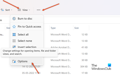 Ouvrez l'explorateur de fichiers et accédez auVoirlanguette. Juste à côté, vous devriez trouver leVoir plusicône visible sous la forme de trois points horizontaux. Cliquez sur l'icône puis sélectionnezPossibilités.