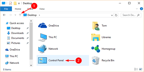 A Fájlböngészőben kattintson a címsor bal oldalán található első nyílra, majd válassza kiVezérlőpulta legördülő menüből.
