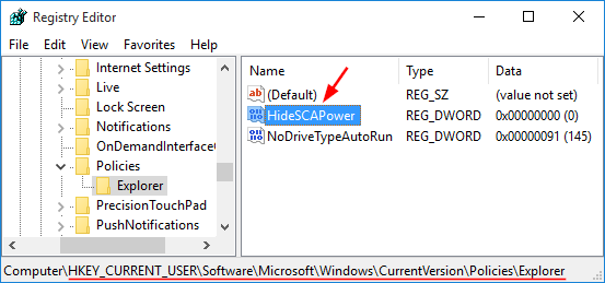 HKEY_CURRENT_USER\Software\Microsoft\Windows\CurrentVersion\Policies\Explorer - Keresse meg aHideSCAPpowerbejegyzést a Rendszerleíróadatbázis-szerkesztő jobb oldali ablaktáblájában. Ha nem létezik, kattintson jobb gombbal az üres helyre, és válassza kiÚj->DWORD (32 bites) érték, majd nevezd el ígyHideSCAPpower.