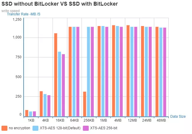 a különböző BitLocker titkosítási algoritmusok kis hatással vannak az SSD olvasási és írási teljesítményére.