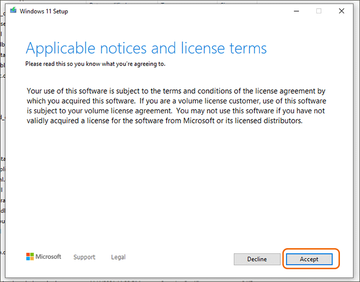 2. lépés:Kattintson duplán a letöltött MediaCreationToolW11 elemre, majd kattintson az Elfogadás gombra a vonatkozó közlemények és licencfeltételek elfogadásához.