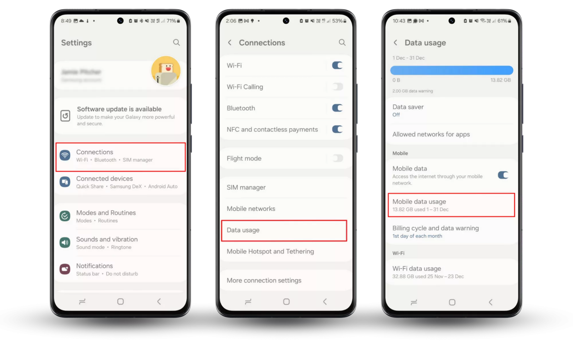 1-3. lépés: Nyissa meg a Beállítások > Kapcsolatok > Adathasználat > Mobil adathasználat menüpontot, és keressen gyanús adatmennyiséget használó alkalmazásokat.6. Ellenőrizze, nincs-e zaj telefonhívás közben