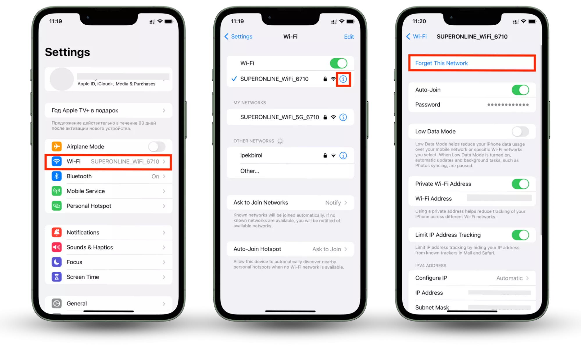 Ha a telefon egy ismeretlen hálózathoz csatlakozik, az azt jelzi, hogy kémprogram fertőzött. Nyissa meg a kezdőképernyőrőlBeállítások > Wi-Fi. Ellenőrizze a Wi-Fi kapcsolatok listáját. Ha van olyan hálózat, amelyet nem ismer fel, azonnal bontsa le a kapcsolatot velük. Ezután érintse meg az Info ikont a hálózat mellett, és válassza kiFelejtsd el ezt a hálózatot.