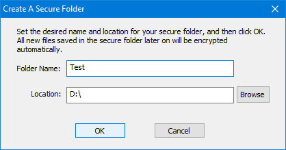 A felugró ablakban adja meg a létrehozni kívánt biztonságos mappa nevét, és tallózással keresse meg a tárolni kívánt helyet. KattintsonRENDBEN.
