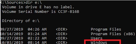 A kötetek mérete alapján a Windows valószínűleg telepítve van aÉS:hajtás. Ellenőrizze a következő parancs futtatásával:dir e: