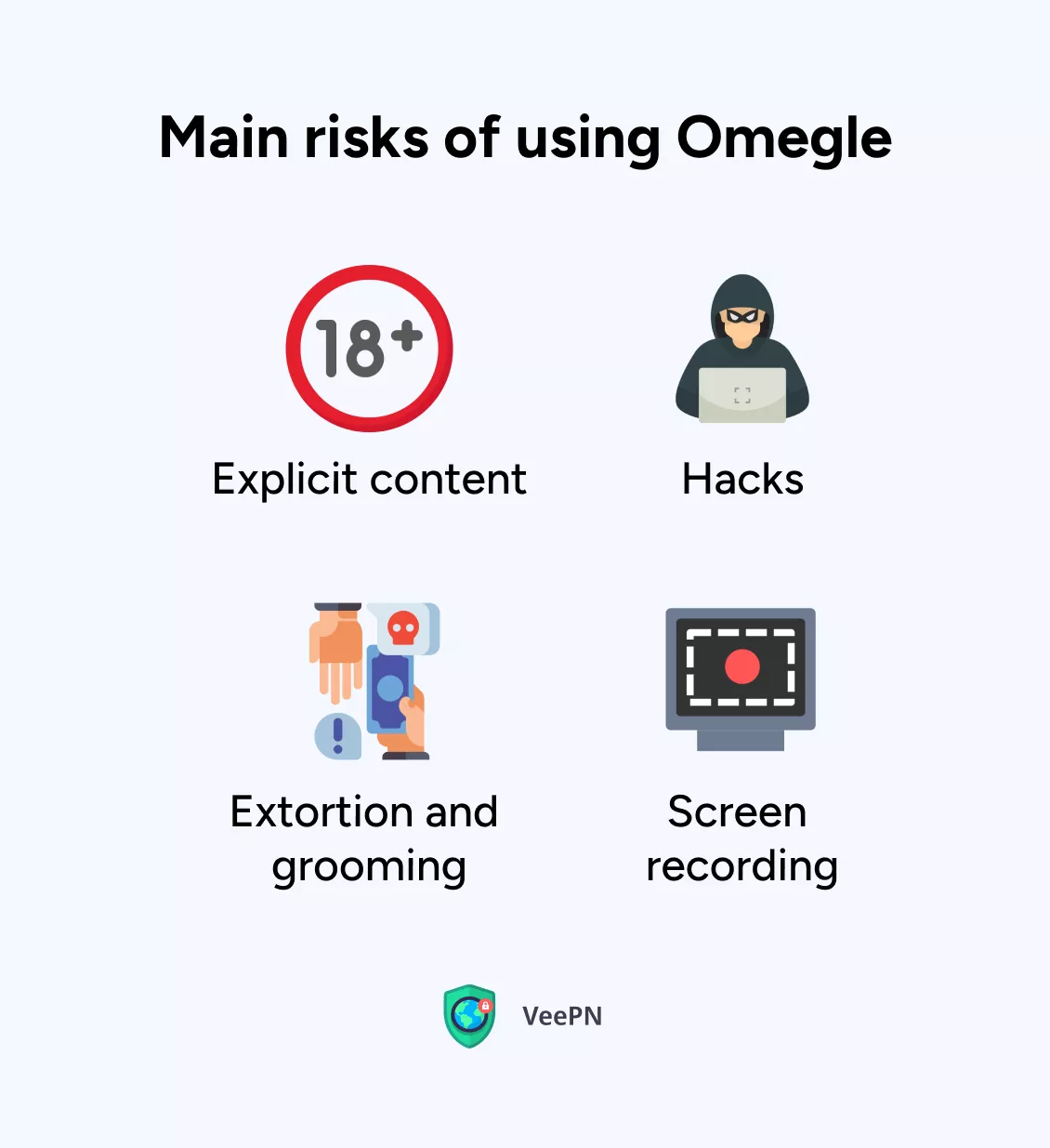 Vegye figyelembe, hogy nem minden VPN hiteles. Az ingyenes szolgáltatások gyakran nélkülözik a fontos funkciókat. Emellett hamis eszközöknek tűnhetnek, amelyek célja az Ön személyes adatainak összegyűjtése és értékesítése, vagy akár rosszindulatú programok bevezetése az eszközére. Ezért javasoljuk, hogy válasszon megbízható VPN-t az Omegle számára, például a VeePN-t. Szigorú No Logs szabályzatot követ (nem gyűjt érzékeny ügyféladatokat), és online adatvédelmi és biztonsági funkciók széles skáláját kínálja.