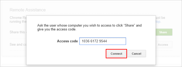 Windows rendszeren indítsa el a Chrome távoliasztal-szolgáltatást. KattintsonKezdje ela Távsegítség alatt, majd kattintson a gombraHozzáférés. Írja be a hozzáférési kódot, kattintsonCsatlakozás. A sikeres csatlakozás után hozzáférhet a Machez.