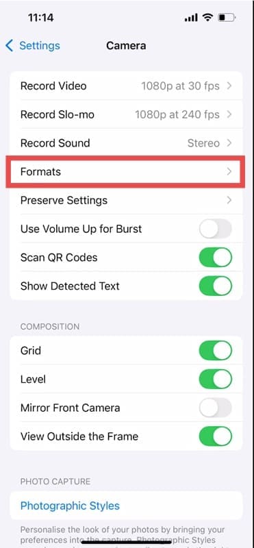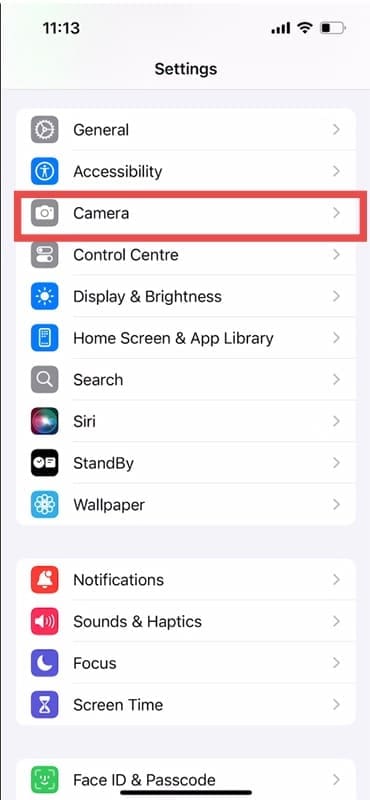 1. lépésiPhone-ján nyissa meg a Beállításokat, és navigáljon le a „Kamera” részhez.