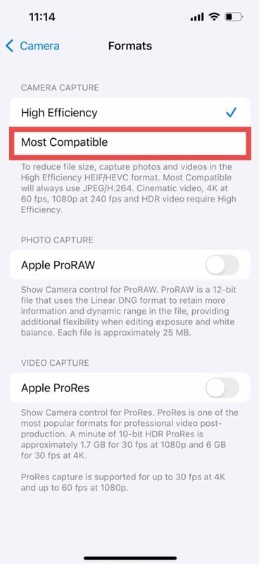 3. lépésA „Camera Capture” alfejléc alatt válassza a „Legkompatibilisebb” lehetőséget a „High Efficiency” helyett.