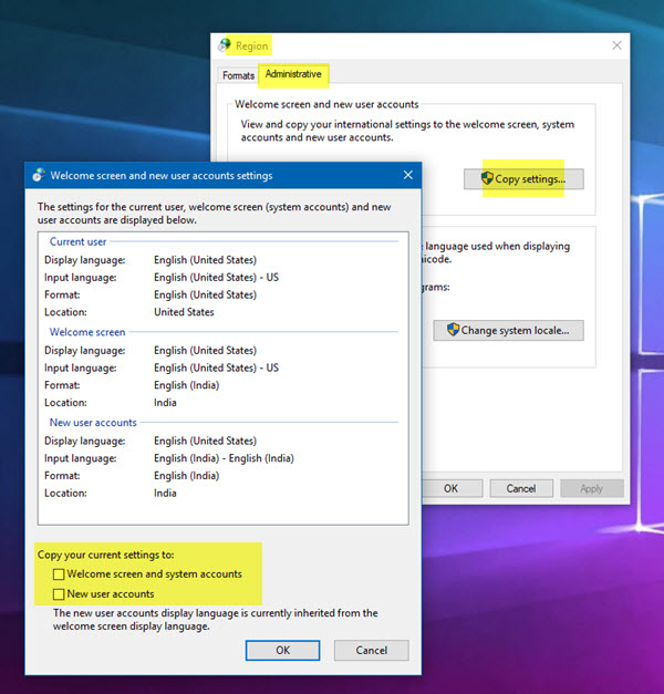 AlattÜdvözlőképernyő és új felhasználói fiókok beállítása, kattintson ráBeállítások másolásagomb.