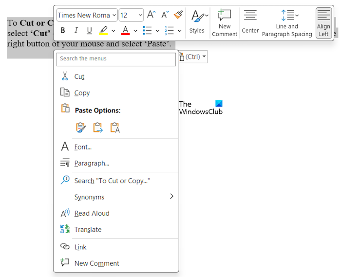 Kattintson az egér jobb gombjával, és válassza a "vágott'vagy'másolat'. A szöveg beillesztéséhez válassza a "Paszta'.ABeillesztési beállítások, ha felajánlják, további beillesztési lehetőségeket kínál, mint például a formázás megtartása/elvetése stb.