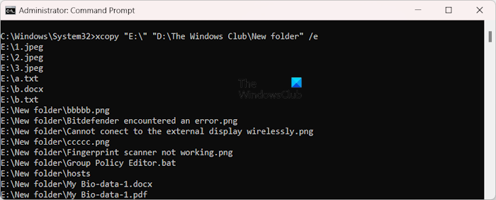 xcopy "E:\" "D:\The Windows Club\New folder"