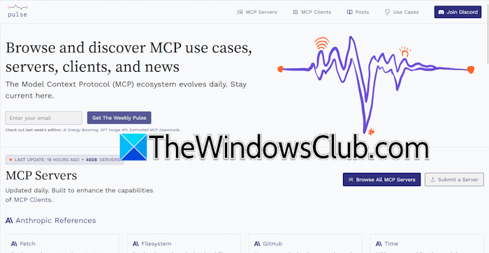 Impulzusegy olyan platform, amely felsorolja az MCP-kiszolgálókat és az MCP-klienseket. Jelenleg több mint 4000 MCP szerverrel rendelkezik. Megjeleníti az egyes MCP-kiszolgálók letöltéseinek számát és csillagos értékelését. Frissítésekért és támogatásért csatlakozhatsz a Discord csatornájukhoz.