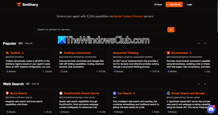 A Smithery egy másik jó webhely, ahol megtalálhatja a legjobb MCP-kiszolgálókat az AI-keretrendszerhez. Az MCP-szervereket a hivatalos weboldalon érheti el,kovácsműhely.ai. Jelenleg a webhely több mint 1500 MCP szerverrel rendelkezik. Az MCP szerverek különböző kategóriákba vannak sorolva. Azt is mutatja, hogy az elmúlt hónapban hány letöltés vagy használat történt. A letöltések és a felhasználások száma fontos tényező az MCP-kiszolgáló használatában.