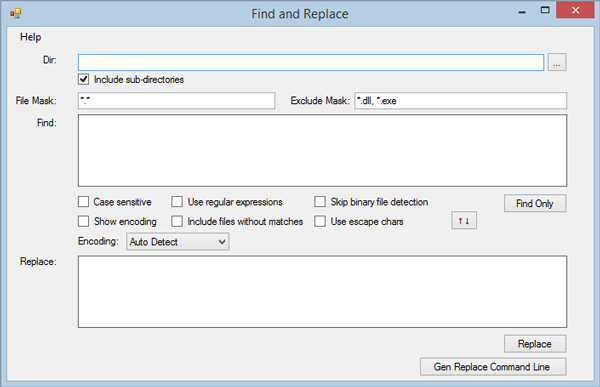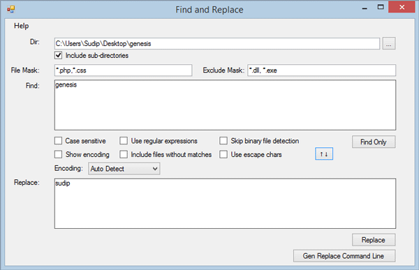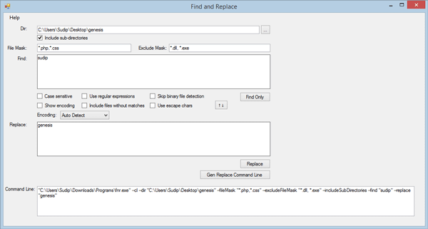"C:\Users\Sudip\Downloads\Programs\fnr.exe" --cl --dir "C:\Users\Sudip\Desktop\genesis" --fileMask "*.php,*.css" --excludeFileMask "*.dll, *.exe" --includeSubDirectories --find "genesis" --replace "sudip"Itt,C:\Users\Sudip\Downloads\Programs\fnr.exea Find and Replace Tool könyvtár ésC:\Users\Sudip\Desktop\genesis az a könyvtár, ahol az összes fájlom található.