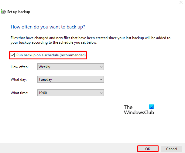 Most kattintson aVáltozás ütemezéslink. Állítsa be az időt, és jelölje be a mellette lévő négyzetetFuttassa a biztonsági mentést ütemezettengomb.