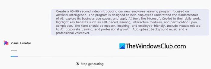 A Microsoft bemutatta aVisual Creator ügynökmásodpilóta tapasztalatának részeként. Kezdetben arra összpontosított, hogy természetes nyelvi utasításokat használva látványelemeket és terveket hozzon létre, és most az eszközzel együttműködve, lehetővé teszi a felhasználók számára, hogy videotartalmat hozzanak létre. Azonban ellentétben, amely hiperrealisztikus, filmszerű látványelemek létrehozását célozza, a Copilot AI a gyors, professzionális megjelenésű üzleti videókra összpontosít, például magyarázókra, képzésekre és marketingtartalomra.