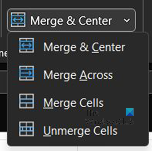 A cellák egyesítéséhez, hogy a nagy cella egy cellaként működjön, három lehetőséget választhat. a lehetőségek megjelenítéséhez válassza ki az egyesíteni kívánt cellákat, majd lépjen a tetejére, és kattintson a mellette lévő legördülő nyílraEgyesítés és középre. Megjelenik a különböző egyesítési lehetőségek listája. Egyesíthet cellákat vízszintesen, függőlegesen vagy a kettő keverékével.