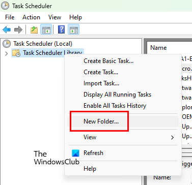 2] Amikor megnyílik a Feladatütemező, kattintson a jobb gombbal aFeladatütemező könyvtármappát, és válassza kiÚj mappa. A Task Scheduler Library mappa a bal oldali panelen érhető el.