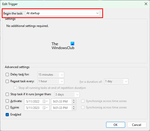 3] Válassza ki aKiváltókfület, és kattintson aÚjgomb. Kattintson aKezdje el a feladatotlegördülő menüből, és válassza kiIndításkoraz opciók listájából.