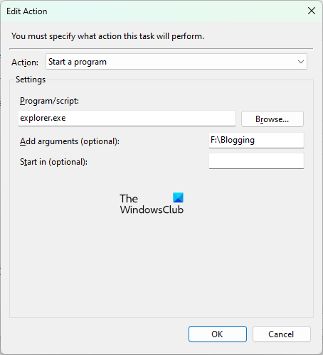 Itt a mappa megnyitására szolgáló program a File Explorer. Ezért írja be az explorer.exe parancsot aProgram/scriptmezőt és a mappa elérési útját aArgumentumok hozzáadása (nem kötelező)mező. KattintsonRENDBENmegmenteni.